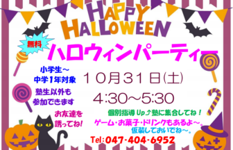 今週土曜日16:30から「個別指導Up⤴塾🎃ハロウィンパーティー」を開催します!小学生と中学1年生のみですが、いつもの勉強モ…