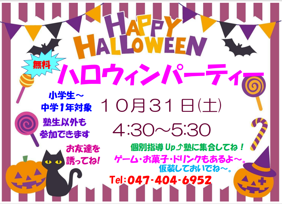 今週土曜日16:30から「個別指導Up⤴塾🎃ハロウィンパーティー」を開催します!