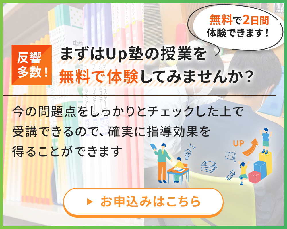 Up塾は、お子様一人ひとりを「我が子のように」大切に考え、日々の学習と真剣に向き合う個別指導塾です。成績を伸ばすために必要なのは、気合いや根性ではなく、正しい学習管理と継続できる仕組み。Up塾では、毎日の家庭学習からテスト対策までを細かく管理し、「今やるべきこと」を明確に示します。だからこそ、勉強が当たり前になり、着実に結果へとつながっていきます。